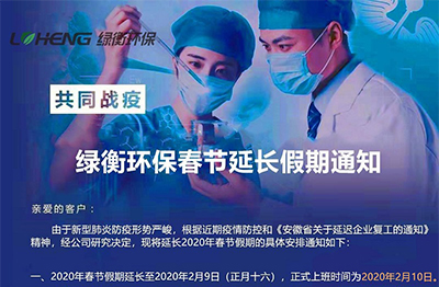 尊敬的客戶:新型肺炎防疫形勢(shì)嚴(yán)峻,結(jié)合國(guó)家防控要求,綠衡環(huán)保經(jīng)研究決定春節(jié)假期延至2月9日,2月10日正式開(kāi)工。全心全意為您服務(wù),共渡難關(guān)再創(chuàng)輝煌。
